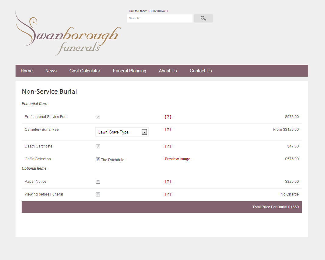 This has been my biggest project so far, taking me 2 months to complete from branding and brochure design to the learning and implementation of the JavaScript language. Each time designing with the knowledge that the client wanted something that I wasn’t very knowledgeable of. Stepping out into a new language and trying to develop a dynamic website with a series of interactive pricing pages really put me out of my comfort zone. The clients Esther and Brian were very patient and gave a lot of their time to help me really understand exactly what it was that they were trying to provide to their customers. This allowed me to create something that the funeral industry in Australia was yet to experience. The pricing page not only gives their customers a better understanding of the normally confusing costing process that would have to be explained over and over again, but it gives them control over how much they want to personalise the services that Swanborough Funerals conducts.